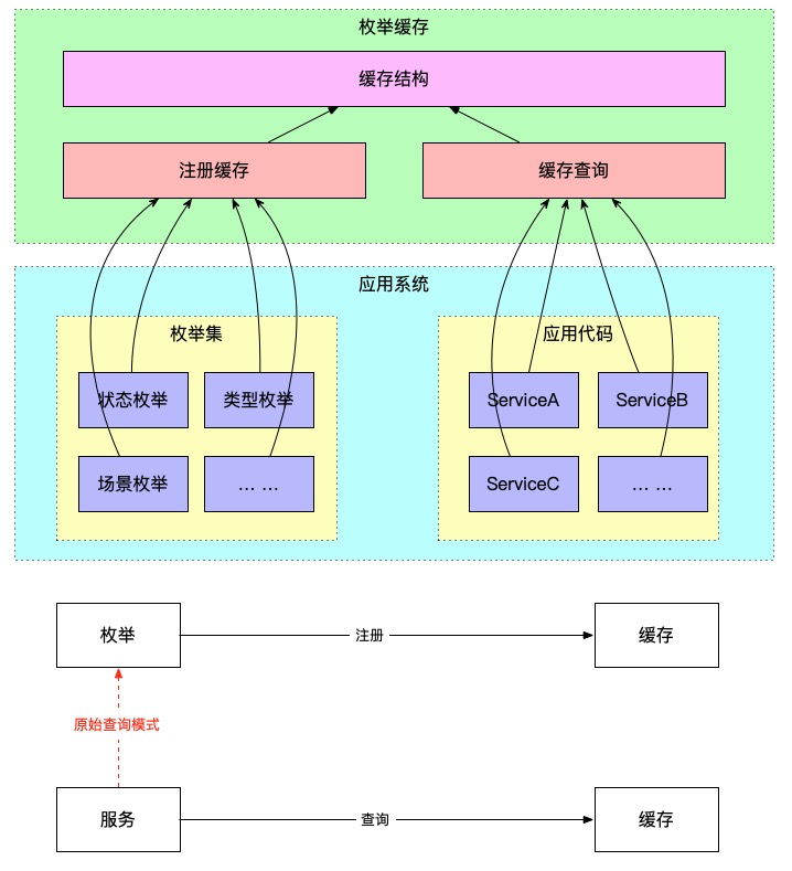 package com.alipay.enumcache;import java.util.Map;import java.util.concurrent.ConcurrentHashMap;/** * 枚举缓存 */public class EnumCache { /** * 以枚举任意值构建的缓存结构 **/ static final Map<Class<? extends Enum>, Map<Object, Enum>> CACHE_BY_VALUE = new ConcurrentHashMap<>(); /** * 以枚举名称构建的缓存结构 **/ static final Map<Class<? extends Enum>, Map<Object, Enum>> CACHE_BY_NAME = new ConcurrentHashMap<>(); /** * 枚举静态块加载标识缓存结构 */ static final Map<Class<? extends Enum>, Boolean> LOADED = new ConcurrentHashMap<>(); /** * 以枚举名称构建缓存,在枚举的效优静态块里面调用 * * @param clazz * @param es * @param <E> */ public static <E extends Enum> void registerByName(Class<E> clazz, E[] es) { Map<Object, Enum> map = new ConcurrentHashMap<>(); for (E e : es) { map.put(e.name(), e); } CACHE_BY_NAME.put(clazz, map); } /** * 以枚举转换出的任意值构建缓存,在枚举的使用静态块里面调用 * * @param clazz * @param es * @param enumMapping * @param <E> */ public static <E extends Enum> void registerByValue(Class<E> clazz, E[] es, EnumMapping<E> enumMapping) { if (CACHE_BY_VALUE.containsKey(clazz)) { throw new RuntimeException(String.format("枚举%s已经构建过value缓存,不允许重复构建", clazz.getSimpleName())); } Map<Object, Enum> map = new ConcurrentHashMap<>(); for (E e : es) { Object value = enumMapping.value(e); if (map.containsKey(value)) { throw new RuntimeException(String.format("枚举%s存在相同的值%s映射同一个枚举%s.%s", clazz.getSimpleName(), value, clazz.getSimpleName(), e)); } map.put(value, e); } CACHE_BY_VALUE.put(clazz, map); } /** * 从以枚举名称构建的缓存中通过枚举名获取枚举 * * @param clazz * @param name * @param defaultEnum * @param <E> * @return */ public static <E extends Enum> E findByName(Class<E> clazz, String name, E defaultEnum) { return find(clazz, name, CACHE_BY_NAME, defaultEnum); } /** * 从以枚举转换值构建的缓存中通过枚举转换值获取枚举 * * @param clazz * @param value * @param defaultEnum * @param <E> * @return */ public static <E extends Enum> E findByValue(Class<E> clazz, Object value, E defaultEnum) { return find(clazz, value, CACHE_BY_VALUE, defaultEnum); } private static <E extends Enum> E find(Class<E> clazz, Object obj, Map<Class<? extends Enum>, Map<Object, Enum>> cache, E defaultEnum) { Map<Object, Enum> map = null; if ((map = cache.get(clazz)) == null) { executeEnumStatic(clazz);// 触发枚举静态块执行 map = cache.get(clazz);// 执行枚举静态块后重新获取缓存 } if (map == null) { String msg = null; if (cache == CACHE_BY_NAME) { msg = String.format( "枚举%s还没有注册到枚举缓存中,请在%s.static代码块中加入如下代码 : EnumCache.registerByName(%s.class, %s.values());", clazz.getSimpleName(), clazz.getSimpleName(), clazz.getSimpleName(), clazz.getSimpleName() ); } if (cache == CACHE_BY_VALUE) { msg = String.format( "枚举%s还没有注册到枚举缓存中,请在%s.static代码块中加入如下代码 : EnumCache.registerByValue(%s.class, %s.values(), %s::getXxx);", clazz.getSimpleName(), clazz.getSimpleName(), clazz.getSimpleName(), clazz.getSimpleName(), clazz.getSimpleName() ); } throw new RuntimeException(msg); } if(obj == null){ return defaultEnum; } Enum result = map.get(obj); return result == null ? defaultEnum : (E) result; } private static <E extends Enum> void executeEnumStatic(Class<E> clazz) { if (!LOADED.containsKey(clazz)) { synchronized (clazz) { if (!LOADED.containsKey(clazz)) { try { // 目的是让枚举类的static块运行,static块没有执行完是站群服务器会阻塞在此的 Class.forName(clazz.getName()); LOADED.put(clazz, true); } catch (Exception e) { throw new RuntimeException(e); } } } } } /** * 枚举缓存映射器函数式接口 */ @FunctionalInterface public interface EnumMapping<E extends Enum> { /** * 自定义映射器 * * @param e 枚举 * @return 映射关系,最终体现到缓存中 */ Object value(E e); }}关键解读