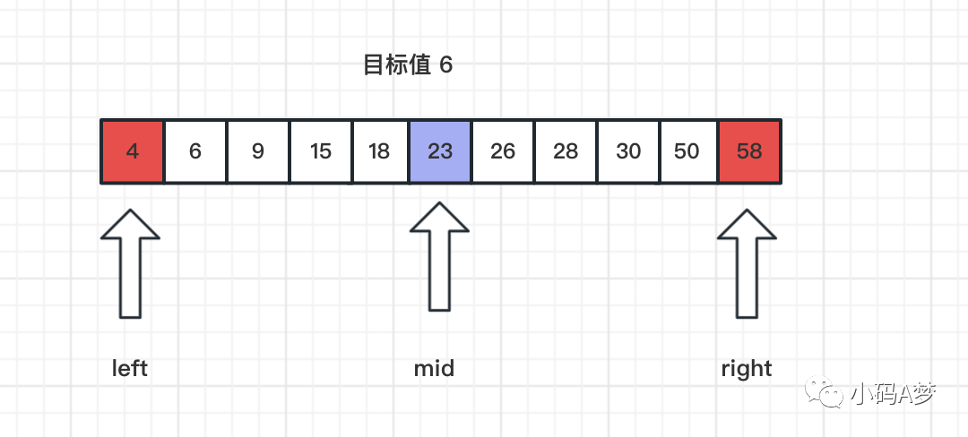 中间值是 23,比目标值更大,就要缩小范围,中间值作为最大值,在中间值左边的区域再找到中间值和目标值比较。