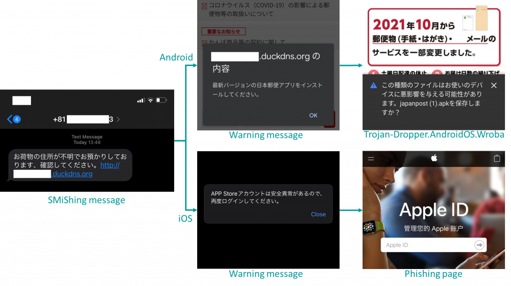 通常情况下,smishing(所谓的肆虐smishing,就是SMS短信和网络钓鱼术语的组合)信息包含一个非常简短的描述和一个登陆页面的URL。如果用户点击该链接并打开登录页面,会出现两种情况:iOS 用户被重定向到模仿苹果官方网站的网络钓鱼页面,而 Wroba 恶意软件被下载到 Android 设备上。服务器租用