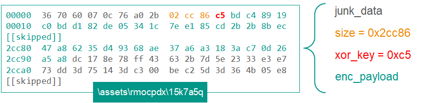 技术分析:Wroba.g/Wroba.o的loader模块研究人员以 kuronekoyamato.apk 为例,对 Wroba.g/Wroba.o 样本进行了深入分析,并观察到了加载程序模块和有效载荷中的一些修改。首先,攻击者将编程语言从 Java 更改为 Kotlin,这是一种旨在与 Java 完全互操作的网站模板编程语言。然后,攻击者删除了 multidex 混淆技巧。取而代之的是,嵌入有效载荷 (\assets\rmocpdx\15k7a5q) 的数据结构也被修改如下: