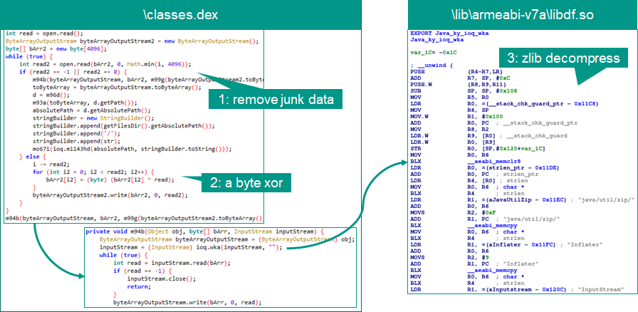 数据的前 8 个字节是垃圾代码(灰色),然后是有效载荷的大小(橙色)、单字节异或密钥(红色)、加密的有效载荷(绿色)和更多的垃圾代码(灰色)。此外,在 APK 文件中嵌入了一个 ELF 文件 \lib\armeaib-v7a\libdf.so:它使用 Java 原生接口 (JNI) 作为第二阶段的有效载荷,用于解密和加载功能的一部分。解密过程和算法只需以下三个步骤: