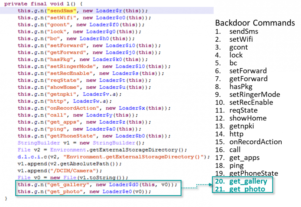 另一个修改是在后门命令中,开发人员添加了两个后门命令——“get_photo”和“get_gallery”,并删除了命令“show_fs_float_window”。总的来说,有21个嵌入式后门命令。
