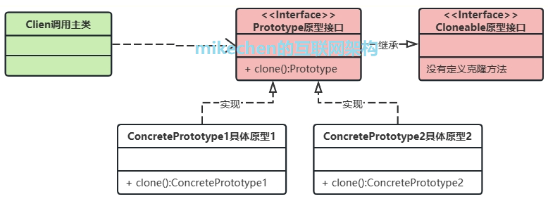 抽象原型(Prototype):可以是抽象类或接口,规定了具体原型对象必须实现的 clone() 方法。