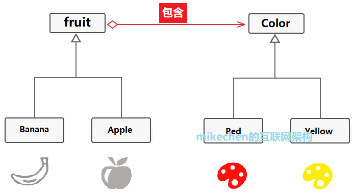 假设:一个水果类 fruit ,它可以扩展出两个子类:香蕉 banana 、苹果 apple。我们需要扩展类层次结构使其包含颜色,因此创建了名为红色 Red 和黄色 Yellow 的颜色子类。