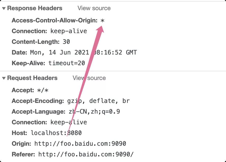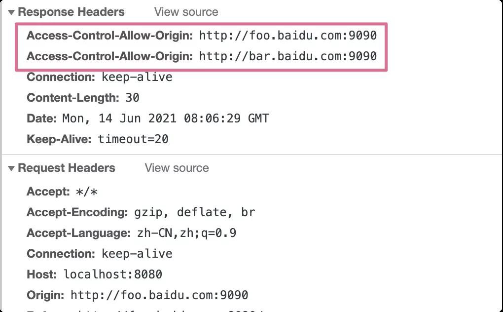 复制private void setCrosHeader(HttpServletResponse resp) { resp.addHeader("Access-Control-Allow-Origin", "http://foo.baidu.com:9090"); resp.addHeader("Access-Control-Allow-Origin", "http://bar.baidu.com:9090"); } 1.2.3.4.小细节:这里将setHeader改用为addHeader(xxx)了哟,你懂的?