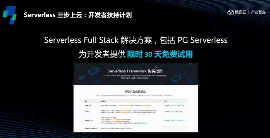 此外, 腾讯云推出了Serverless全线产品扶持计划,Serverless全栈解决方案提供限时30天的免费试用期,让开发者利用腾讯云Serverless产品体验实现业务逻辑。
