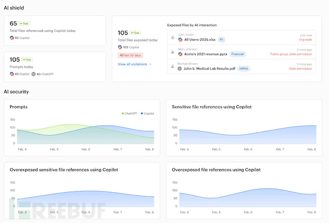 Varonis AI Shield 持续分析 AI 安全态势,监控 AI 数据交互行为,动态调整权限设置以防止敏感信息泄露。其专利权限分析算法会综合数据敏感性、时效性、用户画像等要素,智能决定哪些数据应对 AI 实施访问限制。