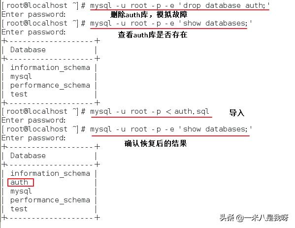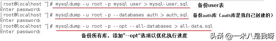 示例:将mysql库中的user表导出为mysql-user.sql,将整个auth库导出为auth.sql,将所有库导出为all-data.sql文件。如下图: