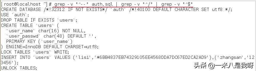 通过mysqldump工具导出的SQL脚本是文本文件,其中"/*...*/"部分或以"--"开头的行为注释信息,使用grep、less、cat等文本工具可以查看脚本内容。如下图(查看auth.sql文件中的内容):