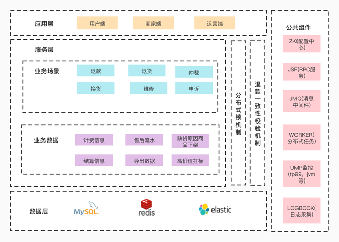 售后系统使用的就是基础的三层架构。应用层有不同身份的三个端入口,服务层提供了一些业务支持和数据支持,数据层目前使用到了MySQL和Redis以及ElasticSearch。当然还有一些中间件使用,比如rpc框架,zk配置中心,worker分布式定时任务,源码库yhq消息。还有完善的基础设施,统一监控和日志采集。