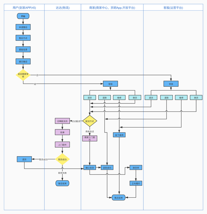 当正向订单履约完成后,如订单中商品有缺件、错件、质量等问题可以发起售后申请。目前申请售后支持用户端、商家端、到家客服发起。用户端申请需要根据不同责任方分配到商家或者客服审核。商家端只能选择商家责任原因申请售后,然后自动审核通过。客服代用户申请售后和用户端一致,流转到商家或客服审核。