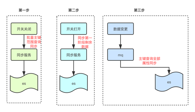 首先增加一个开关来控制操作是走mysql还是es。先关闭开关然后通过批量同步接口,根据主键id范围区间查询把存量数据分批同步到ES中。