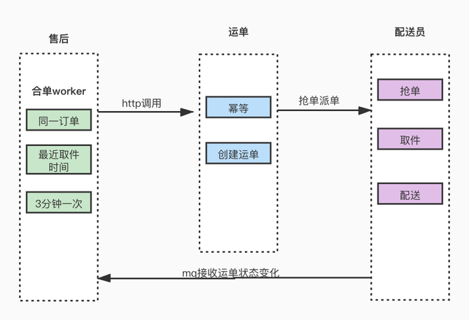 退货退款售后单,商家或平台审核通过后,需要退回订单中货物。这里就需要与达达交互,召唤配送员走逆向取件流程。在创建运单召唤达达配送前售后这边会有一个合单逻辑。