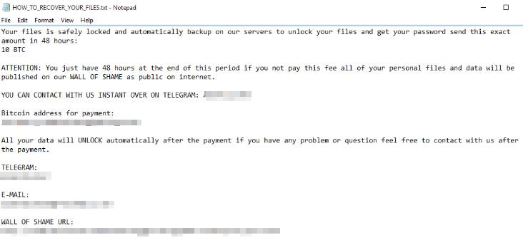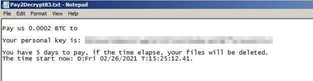 此变体会通知受感染的设备的受害者,如果他们在五天内未支付0.0002比特币(截至撰写时价值9.79美元)的赎金,则所有文件都将被删除。