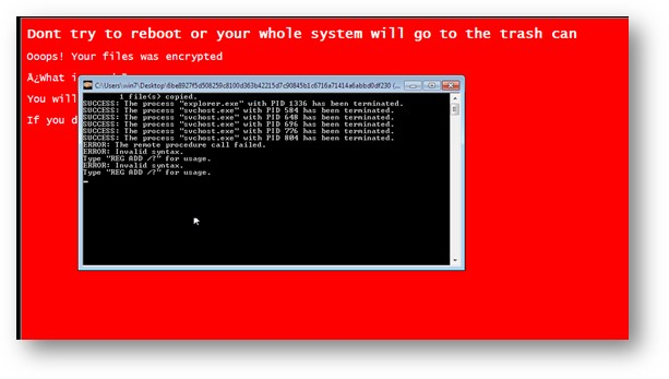 该恶意软件将生成一个随机字符串,然后将其用于附加受感染的文件。该恶意软件还会显示一个赎金记录,该赎金记录被设置为用户的锁定屏幕图像,警告受害者不要重新启动系统。