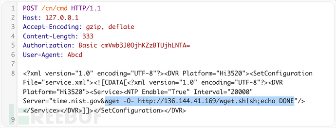 该漏洞利用带有恶意代码的POST请求,提交到dvr/cmd,旨在修改摄像机的NTP配置。如果成功,新配置将执行wget命令从136.144.41[.]169下载文件( wget.sh ),然后运行它。如果不成功,恶意软件会尝试将命令注入cn/cmd。wget.sh文件下载为多种架构编译的Mirai 有效载荷,并在受感染的设备上执行它们。其中一些有效载荷在近期和2022年3月被上传到 VirusTotal,这表明测试期是新鲜的。