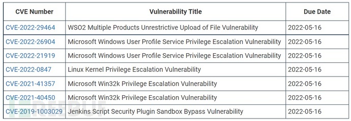 下面列出了本周添加的七个新漏洞,CISA 要求在 2022年5月16日之前对所有这些漏洞进行修补。