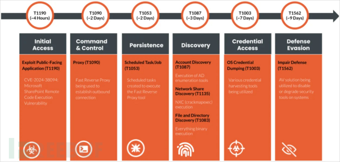 起初,攻击者利用CVE-2024-38094漏洞公开披露的PoC获得了对服务器的访问权限,并植入webshell。随后,该攻击者入侵了一个具有域管理员权限的微软Exchange服务账户,以此获得更高级别的访问权限。
