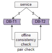 如上图所示,线下启动一个离线的扫描工具,不停地比对正表T1和反表T2,如果发现数据不一致,就进行补偿修复。
