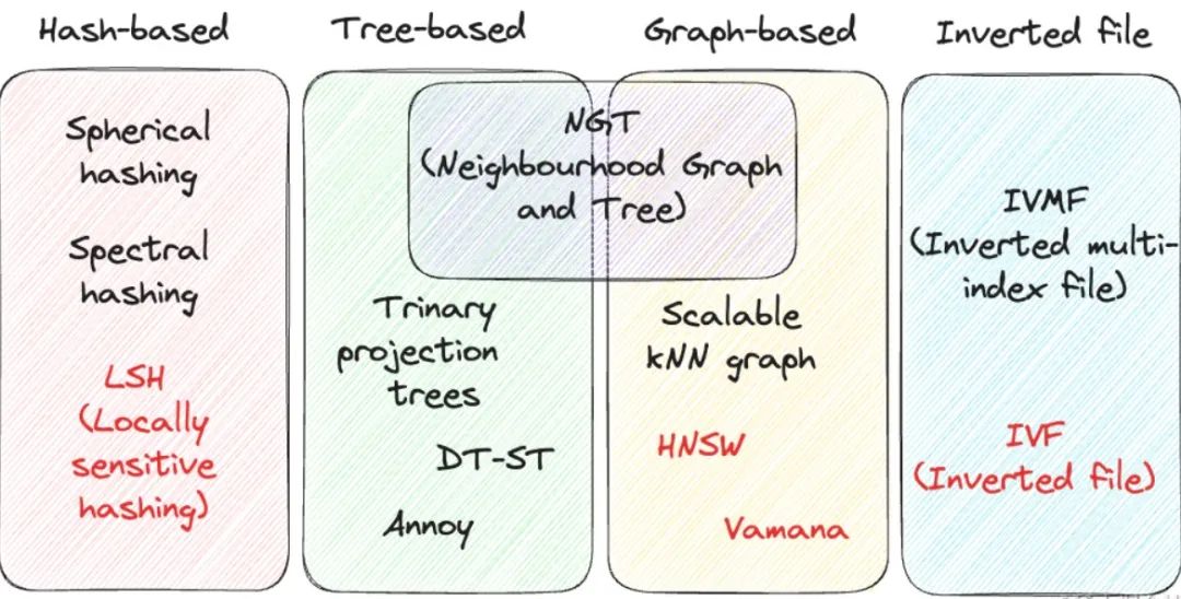 其中,向量检索算法是向量数据库的核心之一。向量检索可以看为是近似最近邻搜索,通过预先的索引构建来减小数据查询时的搜索空间,加快检索速度。目前主要的几种检索算法有: