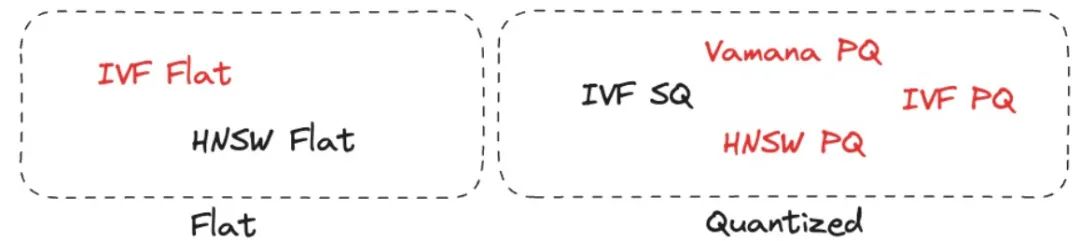 根据数据压缩方式建立索引, 主要包括平坦压缩和量化压缩。平坦压缩是指以未经修改的形式存储向量的索引,量化中索引的底层向量被分解成由较少字节组成的块(通常通过将浮点数转换为整数)以减少内存消耗和搜索过程中的计算成本。