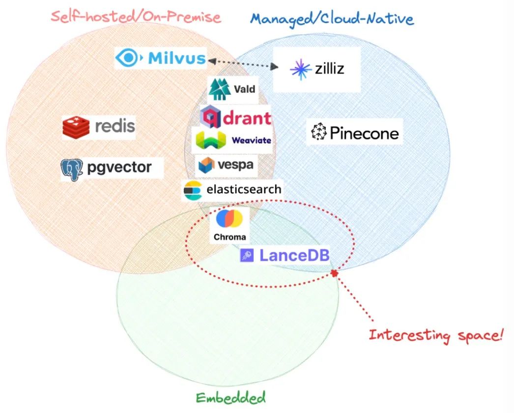 向量数据库的典型部署方式包括本地部署和托管/云原生,两者都遵循CS架构。还有一种新的选择是嵌入式模式,其中数据库本身与应用程序代码紧密耦合,以serverless的方式运行。目前,只有Chroma和LanceDB可用作嵌入式数据库。
