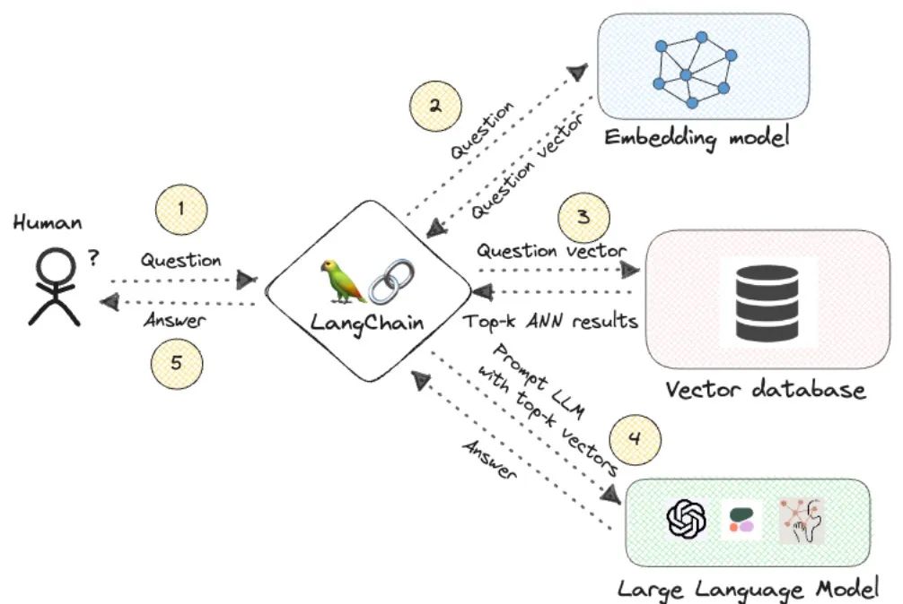 用户通过界面用自然语言提出问题。问题的文本被传递给嵌入模型,然后返回一个句子嵌入向量。问题向量被传递给向量数据库,通过ANN搜索返回与之最相似的前k个结果。这一步非常关键,因为它大大缩小了LLM在下一步中的搜索空间。构建一个LLM提示(基于开发者预定义的模板),将其转换为嵌入向量,并传递给LLM。使用类似LangChain的框架可以方便地执行此步骤,因为可以动态构建提示语,并调用LLM的本地嵌入模块,而无需为每个工作流编写大量自定义代码。LLM在前k个结果中搜索信息,并生成问题的答案,答案发送回用户。