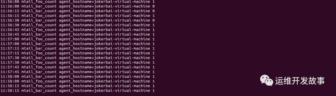 复制# 在log1目录中创建b.log $ touch b.log # 然后为b.log重新创建一个指标脚本 $ cat prog1/prog2.mtail counter bar_count /bar/{ bar_count++ } # 启动mtail $ mtail -progs ~/Desktop/mtail/prog1 -logs ~/Desktop/mtail/log1/a.log -logs ~/Desktop/mtail/log1/b.log # 向b.log写入日志 $ echo "bar" >> ~/Desktop/mtail/log1/b.log # 查看指标 $ curl 127.0.0.1:3903/metrics # HELP bar_count defined at prog2.mtail:1:9-17 # TYPE bar_count counter bar_count{prog="prog2.mtail"} 2 # HELP foo_count defined at prog1.mtail:1:9-17 # TYPE foo_count counter foo_count{prog="prog1.mtail"} 01.2.3.4.5.6.7.8.9.10.11.12.13.14.15.16.17.18.19.20.21.22.23.24.可以看到能正常收集指标,但是如果我们向 a.log 也写入 bar 日志,指标会增加吗?