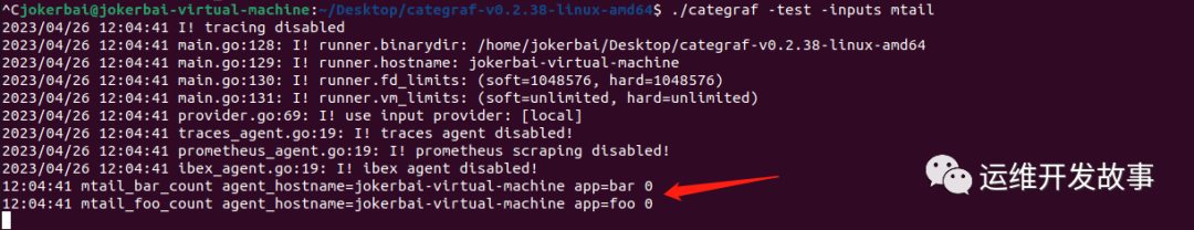 复制# 使用测试模式启动 $ ./categraf -test -inputs mtail1.2.然后往a.log写入foo日志。