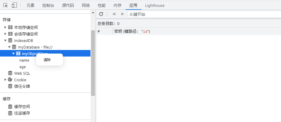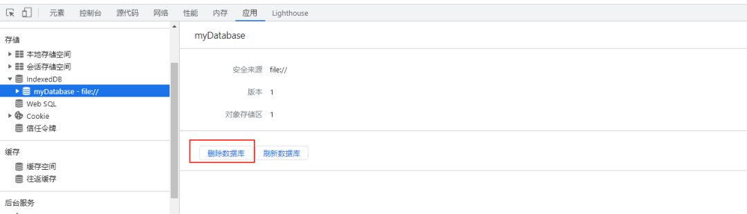 删除整个数据库: 直接在 应用-> 删除数据库 里勾选 IndexedDB 进行清除。