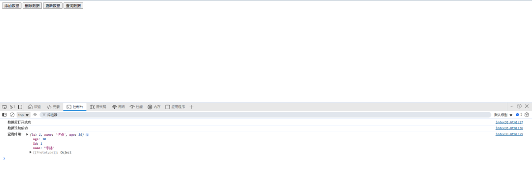 五、代码实战5.1 简单增删改查示例 复制<!DOCTYPE html><html lang="en"><head> <meta charset="UTF-8"> <meta name="viewport" content="width=device-width, initial-scale=1.0"> <title>IndexedDB 增删改查示例</title></head><body> <button id="addBtn">添加数据</button> <button id="deleteBtn">删除数据</button> <button id="updateBtn">更新数据</button> <button id="queryBtn">查询数据</button> <script> // 打开或创建数据库 const request = indexedDB.open(myDatabase, 1); // 数据库打开失败 request.onerror = function (event) { console.error(数据库打开失败:, event.target.errorCode); }; // 数据库打开成功 request.onsuccess = function (event) { const db = event.target.result; console.log(数据库打开成功); // 添加数据 document.getElementById(addBtn).addEventListener(click, function () { const transaction = db.transaction([myObjectStore], readwrite); const objectStore = transaction.objectStore(myObjectStore); const data = { id: 1, name: 李强, age: 30 }; const addRequest = objectStore.add(data); addRequest.onsuccess = function () { console.log(数据添加成功); }; addRequest.onerror = function (event) { console.error(数据添加失败:, event.target.errorCode); }; }); // 删除数据 document.getElementById(deleteBtn).addEventListener(click, function () { const transaction = db.transaction([myObjectStore], readwrite); const objectStore = transaction.objectStore(myObjectStore); const deleteRequest = objectStore.delete(1); deleteRequest.onsuccess = function () { console.log(数据删除成功); }; deleteRequest.onerror = function (event) { console.error(数据删除失败:, event.target.errorCode); }; }); // 更新数据 document.getElementById(updateBtn).addEventListener(click, function () { const transaction = db.transaction([myObjectStore], readwrite); const objectStore = transaction.objectStore(myObjectStore); const data = { id: 1, name: Jane, age: 30 }; const putRequest = objectStore.put(data); putRequest.onsuccess = function () { console.log(数据更新成功); }; putRequest.onerror = function (event) { console.error(数据更新失败:, event.target.errorCode); }; }); // 查询数据 document.getElementById(queryBtn).addEventListener(click, function () { const transaction = db.transaction([myObjectStore], readonly); const objectStore = transaction.objectStore(myObjectStore); const getRequest = objectStore.get(1); getRequest.onsuccess = function (event) { const result = event.target.result; if (result) { console.log(查询结果:, result); } else { console.log(未找到数据); } }; getRequest.onerror = function (event) { console.error(数据查询失败:, event.target.errorCode); }; }); }; // 数据库版本更新时创建对象仓库和索引 request.onupgradeneeded = function (event) { const db = event.target.result; if (!db.objectStoreNames.contains(myObjectStore)) { const objectStore = db.createObjectStore(myObjectStore, { keyPath: id }); objectStore.createIndex(name, name, { unique: false }); objectStore.createIndex(age, age, { unique: false }); } }; </script></body></html> <!DOCTYPE html> <html lang="en"> <head> <meta charset="UTF-8"> <meta name="viewport" content="width=device-width, initial-scale=1.0"> <title>IndexedDB 增删改查示例</title> </head> <body> <button id="addBtn">添加数据</button> <button id="deleteBtn">删除数据</button> <button id="updateBtn">更新数据</button> <button id="queryBtn">查询数据</button> <script> // 打开或创建数据库 const request = indexedDB.open(myDatabase, 1); // 数据库打开失败 request.onerror = function (event) { console.error(数据库打开失败:, event.target.errorCode); }; // 数据库打开成功 request.onsuccess = function (event) { const db = event.target.result; console.log(数据库打开成功); // 添加数据 document.getElementById(addBtn).addEventListener(click, function () { const transaction = db.transaction([myObjectStore], readwrite); const objectStore = transaction.objectStore(myObjectStore); const data = { id: 1, name: 李强, age: 30 }; const addRequest = objectStore.add(data); addRequest.onsuccess = function () { console.log(数据添加成功); }; addRequest.onerror = function (event) { console.error(数据添加失败:, event.target.errorCode); }; }); // 删除数据 document.getElementById(deleteBtn).addEventListener(click, function () { const transaction = db.transaction([myObjectStore], readwrite); const objectStore = transaction.objectStore(myObjectStore); const deleteRequest = objectStore.delete(1); deleteRequest.onsuccess = function () { console.log(数据删除成功); }; deleteRequest.onerror = function (event) { console.error(数据删除失败:, event.target.errorCode); }; }); // 更新数据 document.getElementById(updateBtn).addEventListener(click, function () { const transaction = db.transaction([myObjectStore], readwrite); const objectStore = transaction.objectStore(myObjectStore); const data = { id: 1, name: Jane, age: 30 }; const putRequest = objectStore.put(data); putRequest.onsuccess = function () { console.log(数据更新成功); }; putRequest.onerror = function (event) { console.error(数据更新失败:, event.target.errorCode); }; }); // 查询数据 document.getElementById(queryBtn).addEventListener(click, function () { const transaction = db.transaction([myObjectStore], readonly); const objectStore = transaction.objectStore(myObjectStore); const getRequest = objectStore.get(1); getRequest.onsuccess = function (event) { const result = event.target.result; if (result) { console.log(查询结果:, result); } else { console.log(未找到数据); } }; getRequest.onerror = function (event) { console.error(数据查询失败:, event.target.errorCode); }; }); }; // 数据库版本更新时创建对象仓库和索引 request.onupgradeneeded = function (event) { const db = event.target.result; if (!db.objectStoreNames.contains(myObjectStore)) { const objectStore = db.createObjectStore(myObjectStore, { keyPath: id }); 