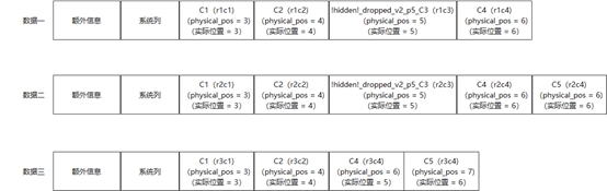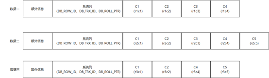 复制CREATE TABLE t1 (C1 char(10), C2 char(10), C3 char(10), C4 char(10)); INSERTINTO t1 values ("r1c1", "r1c2", "r1c3", "r1c4"); -- 数据一 ALTERTABLE t1 ADDCOLUMN C5 CHAR(10) DEFAULT"c5_def", ALGORITHM=INSTANT; INSERTINTO t1 values ("r2c1", "r2c2", "r2c3", "r2c4", "r2c5"); -- 数据二 ALTERTABLE t1 DROPCOLUMN C3, ALGORITHM=INSTANT; INSERTINTO t1 values ("r3c1", "r3c2", "r3c4", "r3c5"); -- 数据三 SELECT * FROM t1; +------+------+------+--------+ | C1 | C2 | C4 | C5 | +------+------+------+--------+ | r1c1 | r1c2 | r1c4 | c5_def | | r2c1 | r2c2 | r2c4 | r2c5 | | r3c1 | r3c2 | r3c4 | r3c5 | +------+------+------+--------+1.2.3.4.5.6.7.8.9.10.11.12.13.14.由于 INSTANT ADD / DROP 操作并不会修改存量数据,因此磁盘上的实际数据如下图所示,其中数据一多了 C3 列,缺少 C5 列,数据二多了 C3 列。