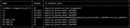 复制ALTER TABLE t1 DROP COLUMN C3, ALGORITHM=INSTANT; INSERT INTO t1 values ("r3c1", "r3c2", "r3c4", "r3c5"); -- 数据三 SELECT NAME, HIDDEN, SE_PRIVATE_DATA FROM mysql.columns WHERE table_id = (SELECT ID FROM mysql.tables WHERE NAME = t1);1.2.3.列元数据查询结果见下图。