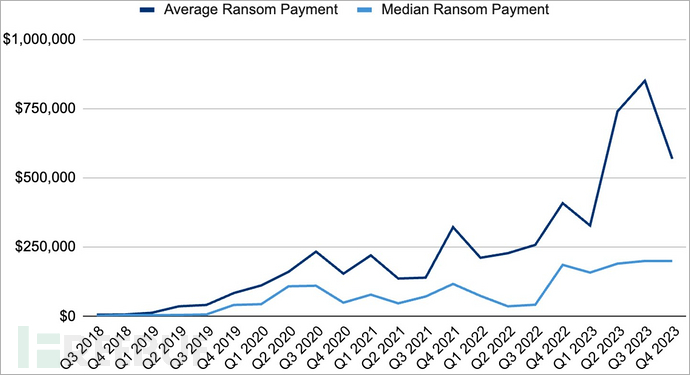 不仅支付勒索软件赎金的受害者数量减少,实际支付的赎金金额也有所下降。Coveware指出,2023年第四季度的赎金支付平均金额为568705美元,比前一季度下降了33%,而中位数赎金支付额为20万美元。b2b信息网