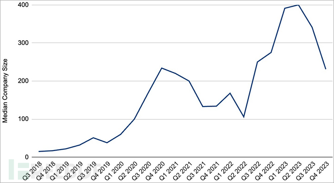 2023年第四季度,受害机构的规模有所下降,扭转了2022年第二季度以来的发展态势。当时,由于攻击者预见赎金支付率会下降,他们开始转而攻击规模更大的公司,以求获得更高的赎金补偿差额。