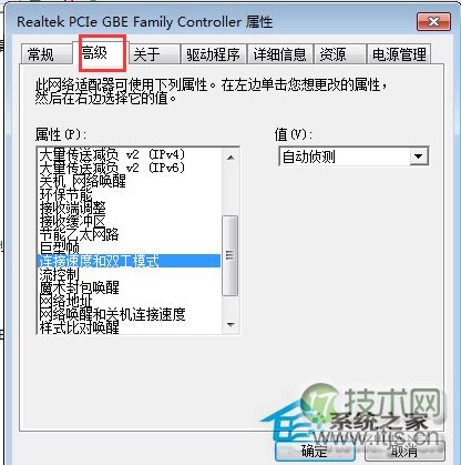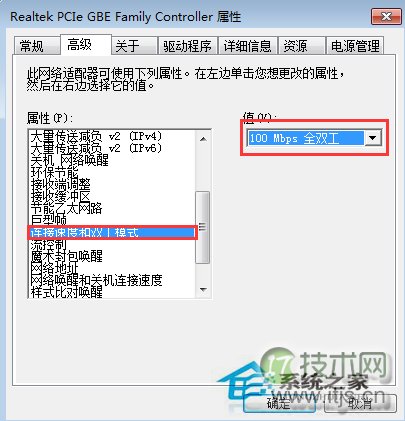 4、在“属性”列表中选项“连接速度和双工模式”后,在值处选择“10Mbps全双工”,确定保存;