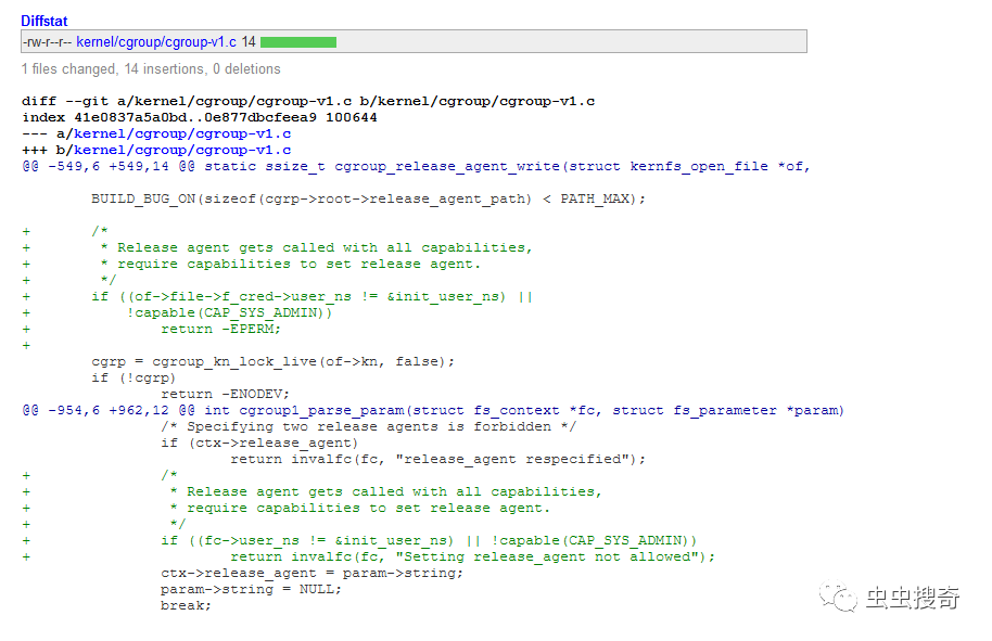 CVE-2022-0492的主要是因为对release_agent文件的进程是否具有管理权限(即 CAP_SYS_ADMIN 功能)未进行检查导致。攻击者可以通过release_agent强制内核以提升的权限调用选择的二进制文件并接管机器。由于release_agent 文件的所有者设置为root,该漏洞的利用需要具有“root”权限的进程才能写入文件,因此, 该漏洞仅允许root进程提升权限。运行 AppArmor或SELinux安全系统的容器不受影响。