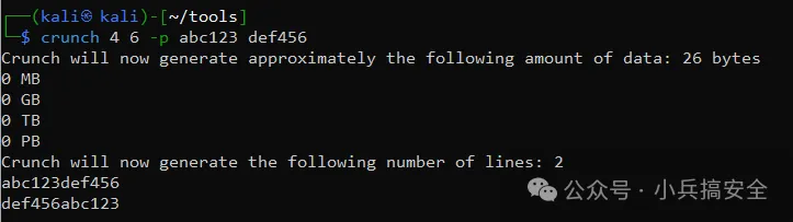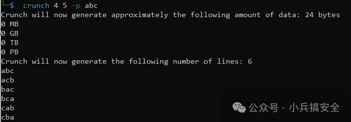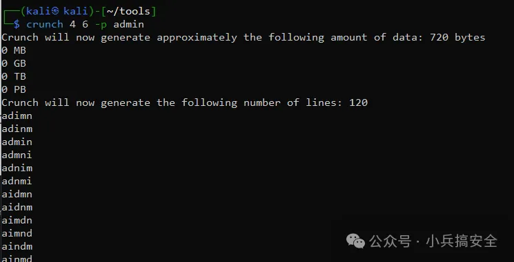 crunch 4 6 -p admin # 生成abc的组合的字典