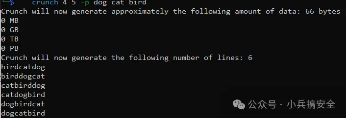 -p charset 或 -p word1 word2 ... 告诉 crunch 生成没有重复字符的单词。默认情况下,WordPress模板crunch 会生成一个字符集中的字符数量的幂次方(#of_chars_in_charset ^ max_length)大小的单词表。此选项将生成字符集中的字符数量的阶乘(#of_chars_in_charset!)。! 表示阶乘。例如,如果字符集是 abc,最大长度是 4,crunch 默认会生成 3^4 = 81 个单词。此选项将生成 3! = 3x2x1 = 6 个单词(abc, acb, bac, bca, cab, cba)。这必须是最后一个选项!此选项不能与 -s 一起使用,并且它忽略了最小和最大长度,但你仍然必须指定两个数字。