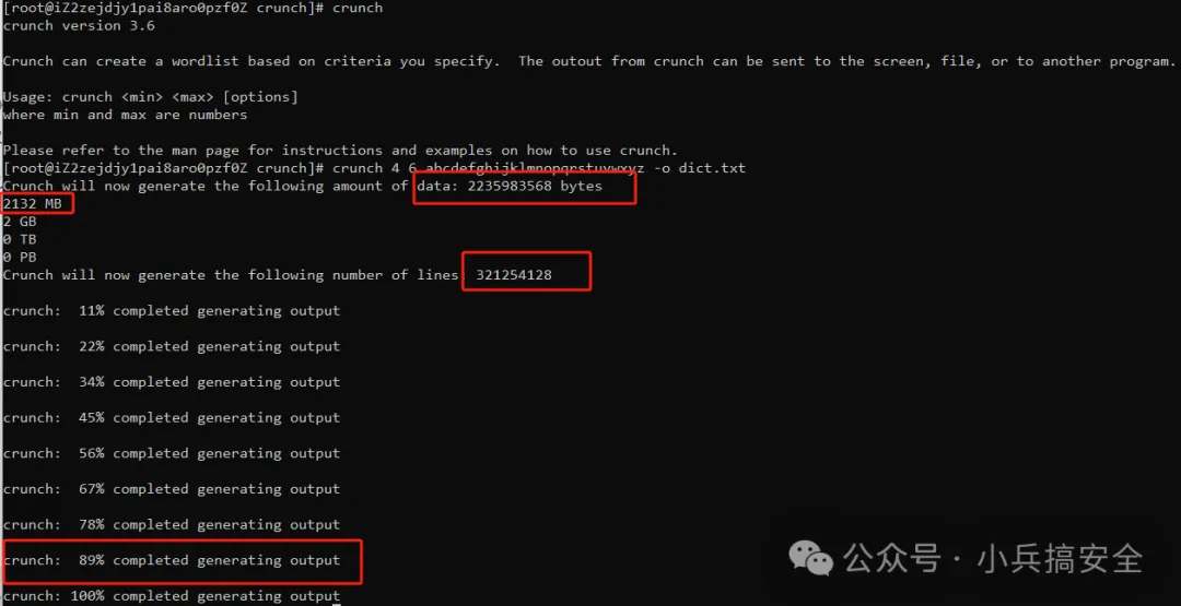 crunch 将生成从 aab!0001!! 开始到 zzy 9998 结束的 10 个字符的字符串。输出将写入 20MB 的文件中。