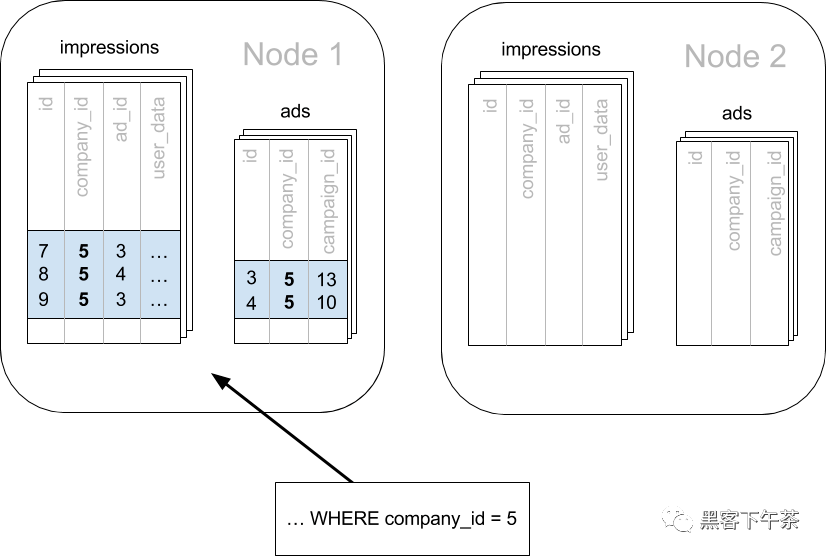 当为同一公司标记行时,我们可以告诉 Citus 使用此列来读取和写入同一节点的行。在 Citus 的术语中,company_id 将是分布列,您可以在分布式数据建模中了解更多信息。
