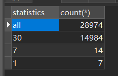 复制SELECT statistics, count(*) from ( SELECT CASE WHEN time_create > 2023-09-12 00:00:00 THEN 1 WHEN time_create > 2023-09-06 00:00:00 THEN 7 WHEN time_create > 2023-08-14 00:00:00 THEN 30 ELSE all END as statistics from `order` where user_id = xxx ) temp GROUP BY statistics;1.2.3.4.5.6.7.8.9.10.执行结果如下: