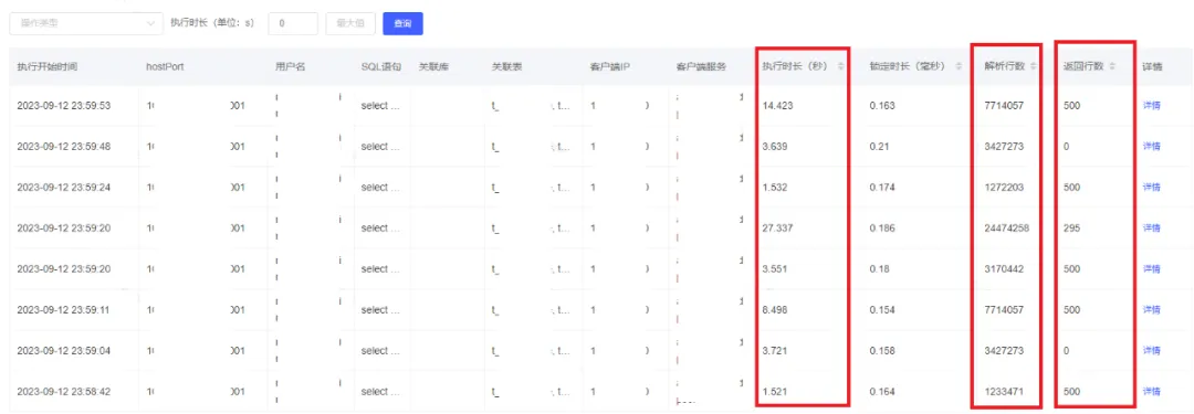 2.1 定位 SQL 执行变慢的度内的原因通过数据库管理平台查看SQL执行信息发现,SQL解析行数(扫描行数)和SQL执行时间都很不稳定,查询执行时长和解析行数(扫描行数)是优化成正比的。