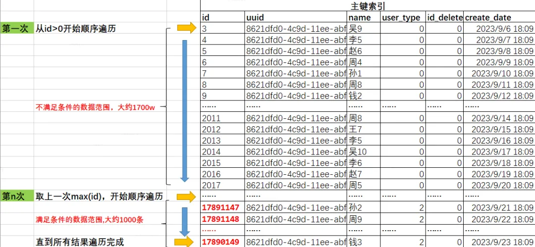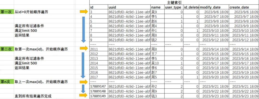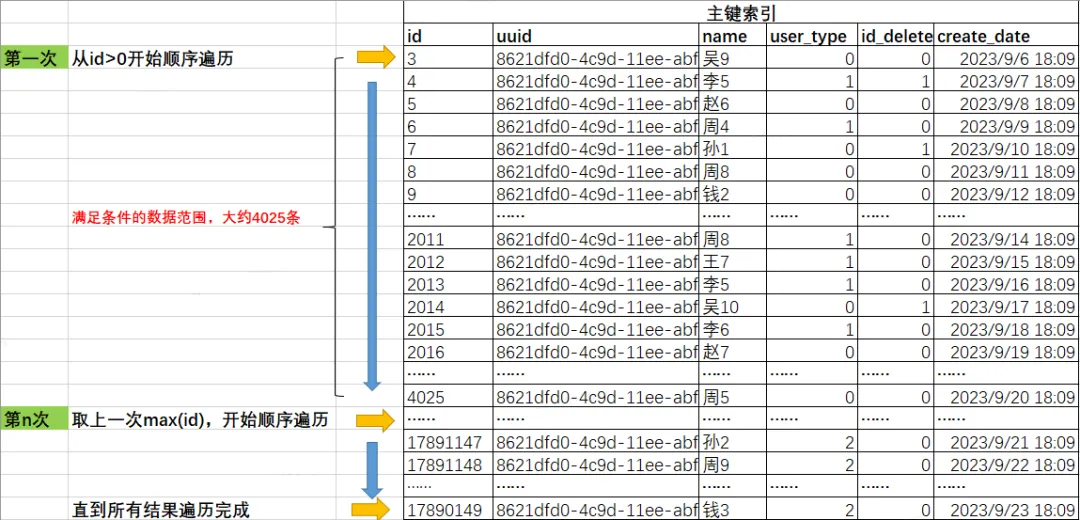 通过简单的图示,描述下SQL扫描过程,由于是通过主键索引遍历,避免了额外的排序行为,从最小id开始取到最大id。