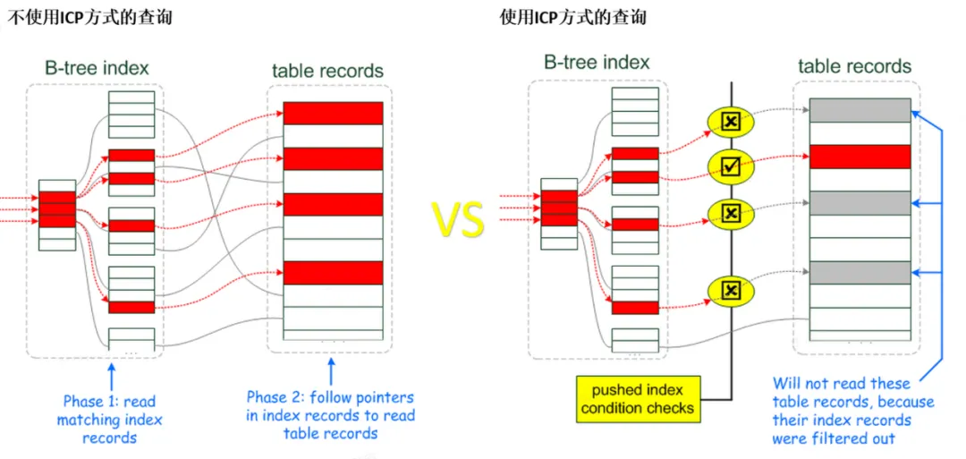 索引条件下推 (ICP) 是针对 MySQL 使用索引从表中检索行的情况的优化。如果没有 ICP,存储引擎会遍历索引以定位基表中的行,并将它们返回给 MySQL server,由 MySQL server评估行的 WHERE 条件。在启用 ICP 的情况下,如果 WHERE 条件的一部分可以通过仅使用索引中的列来评估,MySQL server会将这部分 WHERE 条件下推到存储引擎。然后存储引擎通过使用索引条目来评估推送的索引条件,并且只有在满足这一条件时才从表中读取行。ICP可以减少存储引擎必须访问基表的次数和MySQL server必须访问存储引擎的次数。