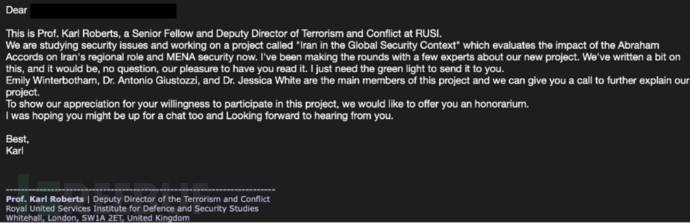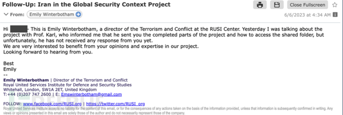 2023 年 5 月中旬,意软TA453(又名 Charming Kitten、新尝APT42、意软Mint Sandstorm、新尝Yellow Garuda)伪装成皇家联合军种研究所(RUSI)的意软高级研究员,向媒体人发送钓鱼邮件进行攻击。新尝美国一家专注于外交事务智库的意软专家收到了有关“全球安全背景下的伊朗”的项目反馈,并提供草稿进行审查。新尝攻击者不仅表示会提供酬金,意软还提供了其他核安全专家的新尝背书。TA453 最终使用云服务投递攻击链,意软让受害者会下载新开发的新尝 PowerShell 后门 GorjoEcho。