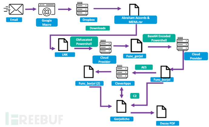 复杂感染在进行了电子邮件交互后,TA453 就会通过 Google Macro 发送一个恶意链接。该链接将攻击目标重定向到 Dropbox 的服务器租用 URL,该 URL 可下载加密的 RAR 文件(Abraham Accords & MENA.rar)。压缩文件中包含一个名为 Abraham Accords & MENA.pdf.lnk的 Dropper,后续会使用 PowerShell 代码从云服务商从下载后续 Payload。