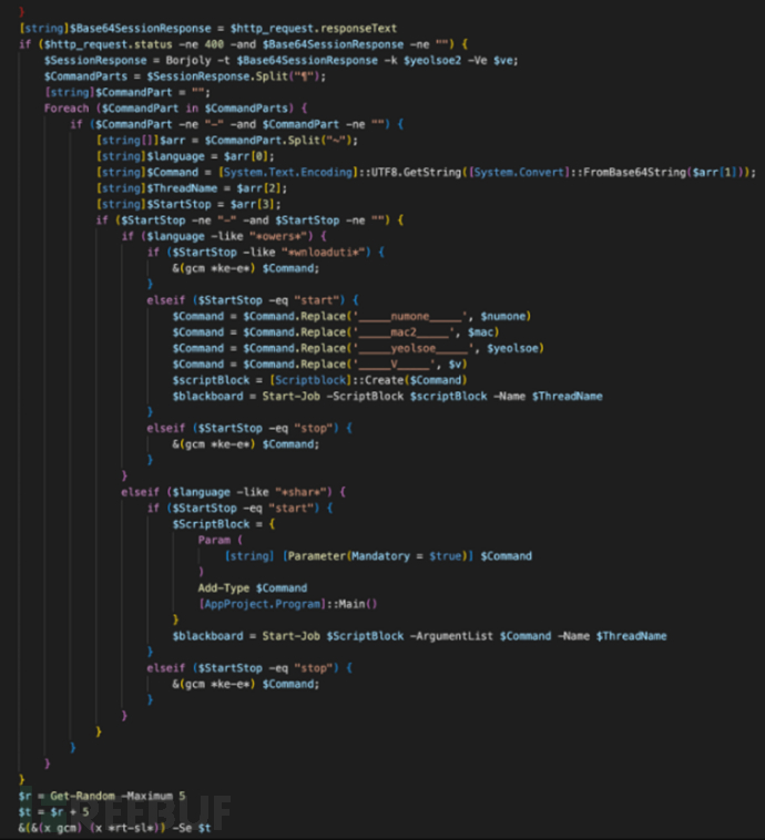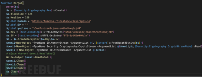 Borjol 通过合法的 Clever Cloud 服务使用 AES 加密的 HTTPS 链接与 fuschia-rhinestone.cleverapps[.]io 进行通信。返回的数据解密为另一个 Borjol 函数,该函数使用之前的变量并解密 PowerShell 后门 GorjolEcho。