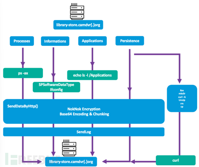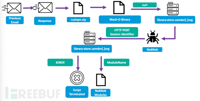 邮件携带一个加密的 ZIP 文件,其中包含一个定制的 Mac 应用程序,该程序伪装成 RUSI 的 VPN 或者共享驱动器的样子。执行后,脚本会通过指定的 URL 下载后续 Payload。二阶段是名为 NokNok 的 bash 脚本,主要是后门程序。通过操作系统名称、主机名称与随机数来创建唯一标识,经过编码与加密后发送到 C&C 服务器。脚本期望的响应为 KillKill 或者 ModuleName,前者会终止运行,后者会执行响应的命令。