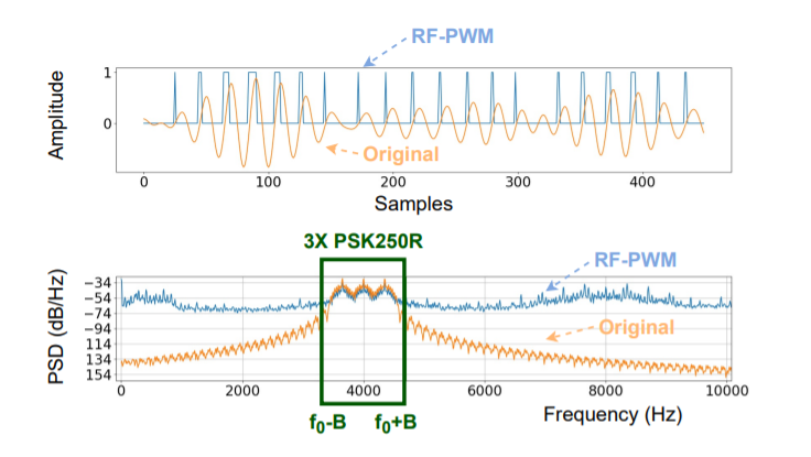 挑战二及解决方案:一般而言,软件只能对泄露的方波进行交叉调制。相反,我们希望产生一个经过幅度、频率和相位调制的任意正弦带通信号。为了解决这个问题,我们利用带通一位编码。具体来说,我们使用RF-PWM,它将此类信号表示为方波的基波分量,忽略作为带外噪声的谐波。